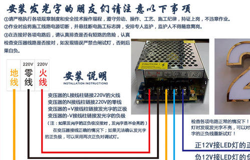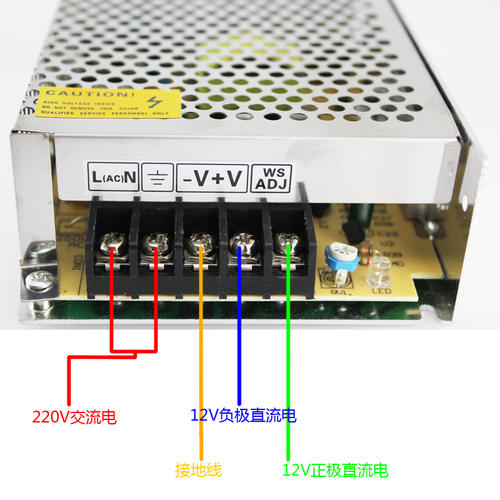 led电源接线方法:LN就是220V交流输入,从市电接过来引出两个叉状端子接上,因为是单相交流电,L跟N随意接。三横一竖是电源外壳的接地端,果然上一步插头用的是三头的那种,这个位置就接接地端,用两头的话这边放着没事。COM+V就是这个电源的输出端,相当于这个电源的接地+12v(电源规格),拉出来接进你的电路就好了。ADJ那个是用来调整输出电压的,比如输出应该是12V,实际输出12.5V这样子的情况,用螺丝刀之类的调整这里就行了。